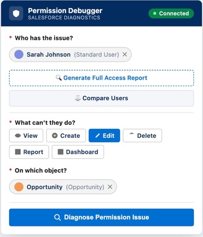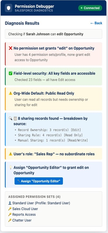 One click reveals the complete picture: CRUD permissions, field-level security, org-wide defaults, sharing rules, and specific fix suggestions.