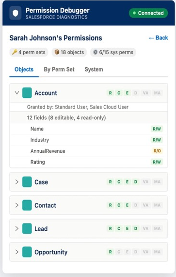 Instantly check Create, Read, Update, Delete permissions on any object — standard or custom.