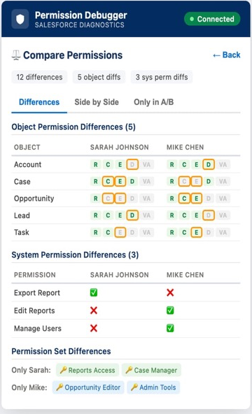 "This user can do it, but that user can't." Compare any two users side-by-side to instantly see every object permission, system permission, and permission set difference.